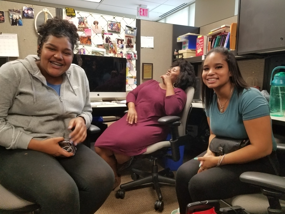 Professor Martina McGhee jokes with some of her students in her office on the campus of University of Texas San Antonio.