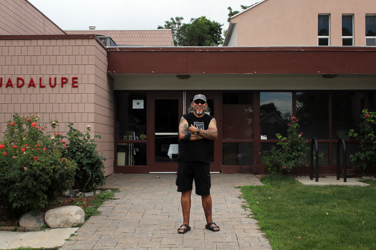 Bear Carrillo stands in front of his mother’s church, Our Lady of Guadelupe in Salt Lake City.