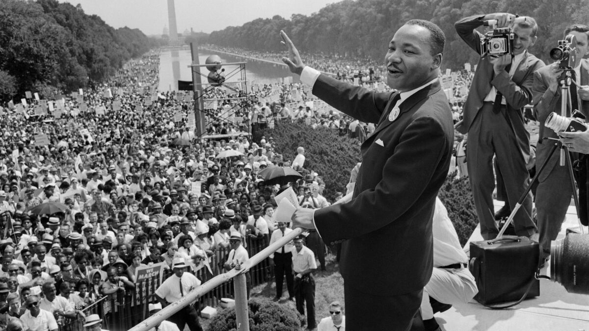 Martin Luther King Jr. stands in front of a crowd in Washington, D.C.