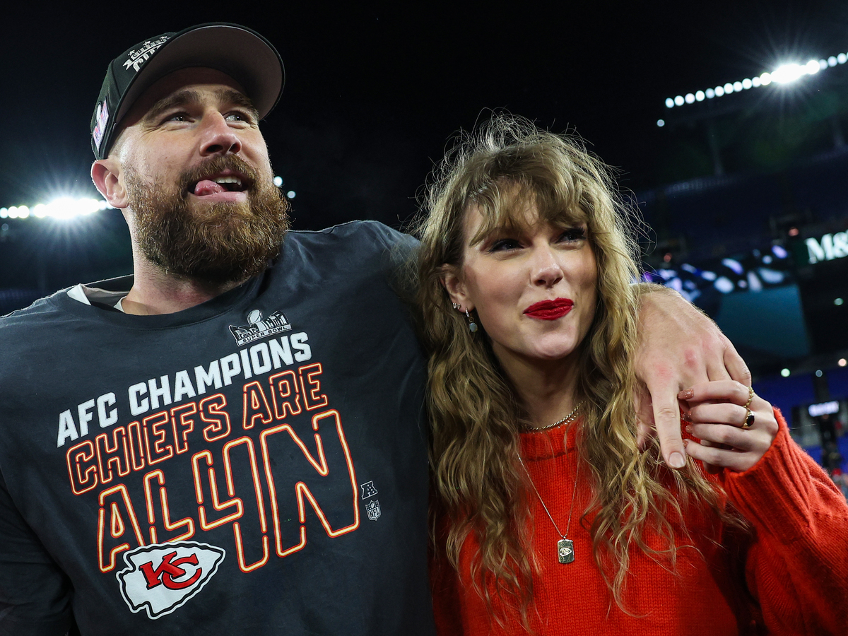 Travis Kelce and Taylor Swift celebrate after the Kansas City Chiefs defeated the Baltimore Ravens in the AFC Championship Game at M&T Bank Stadium in Maryland on Sunday.