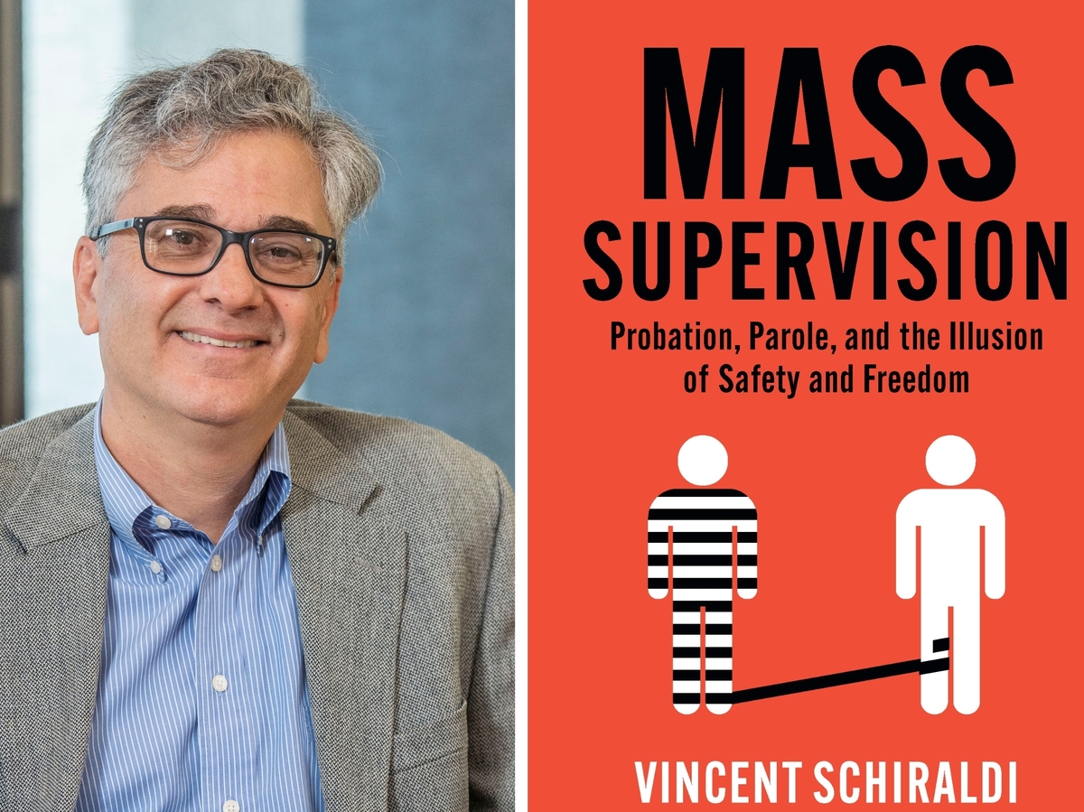 Author Vincent Schiraldi next to the cover of his new book, Mass Supervision.
