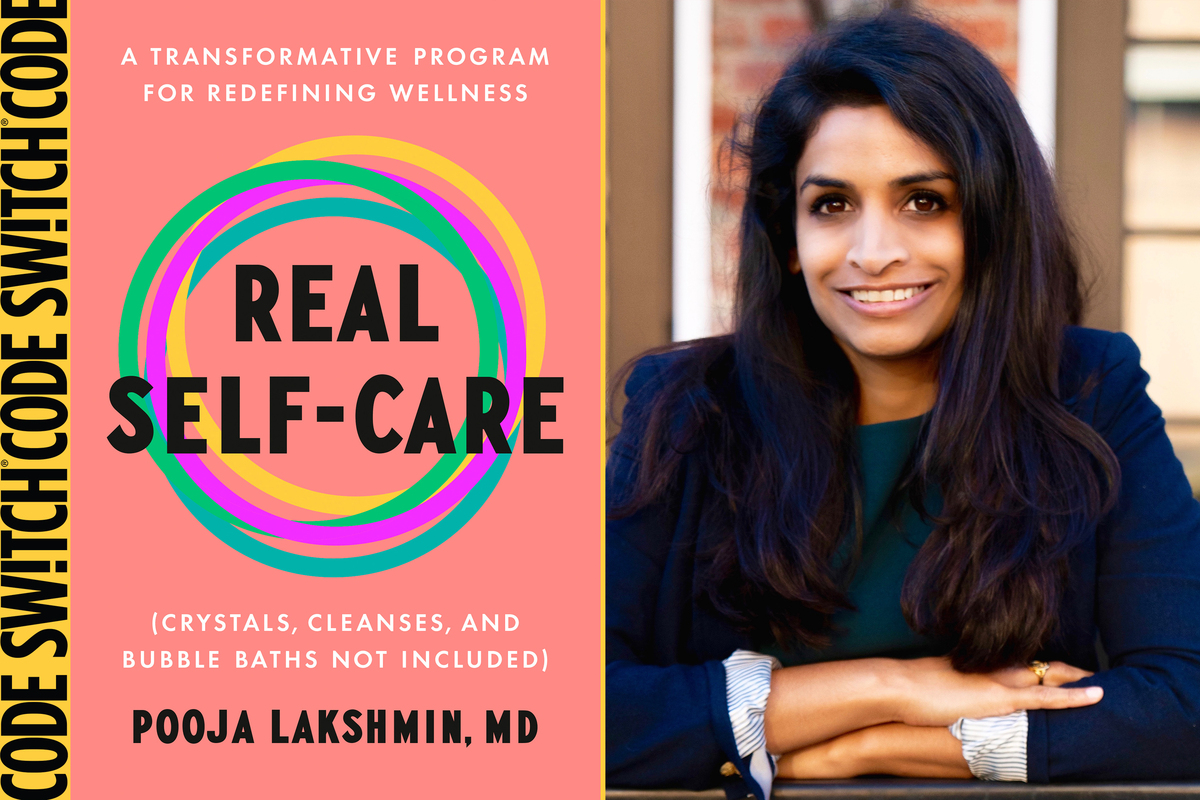 Psychiatrist Pooja Lakshmin next to the cover of her new book, Real Self Care (Crystals, Cleanses and Bubble Baths Not Included.)