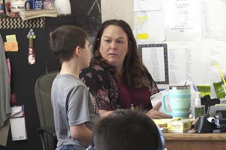 In Kansas, a third grade teacher, Bekah Noel talks to a student between lessons. Teachers say the pandemic caused severe limitations in their teaching.